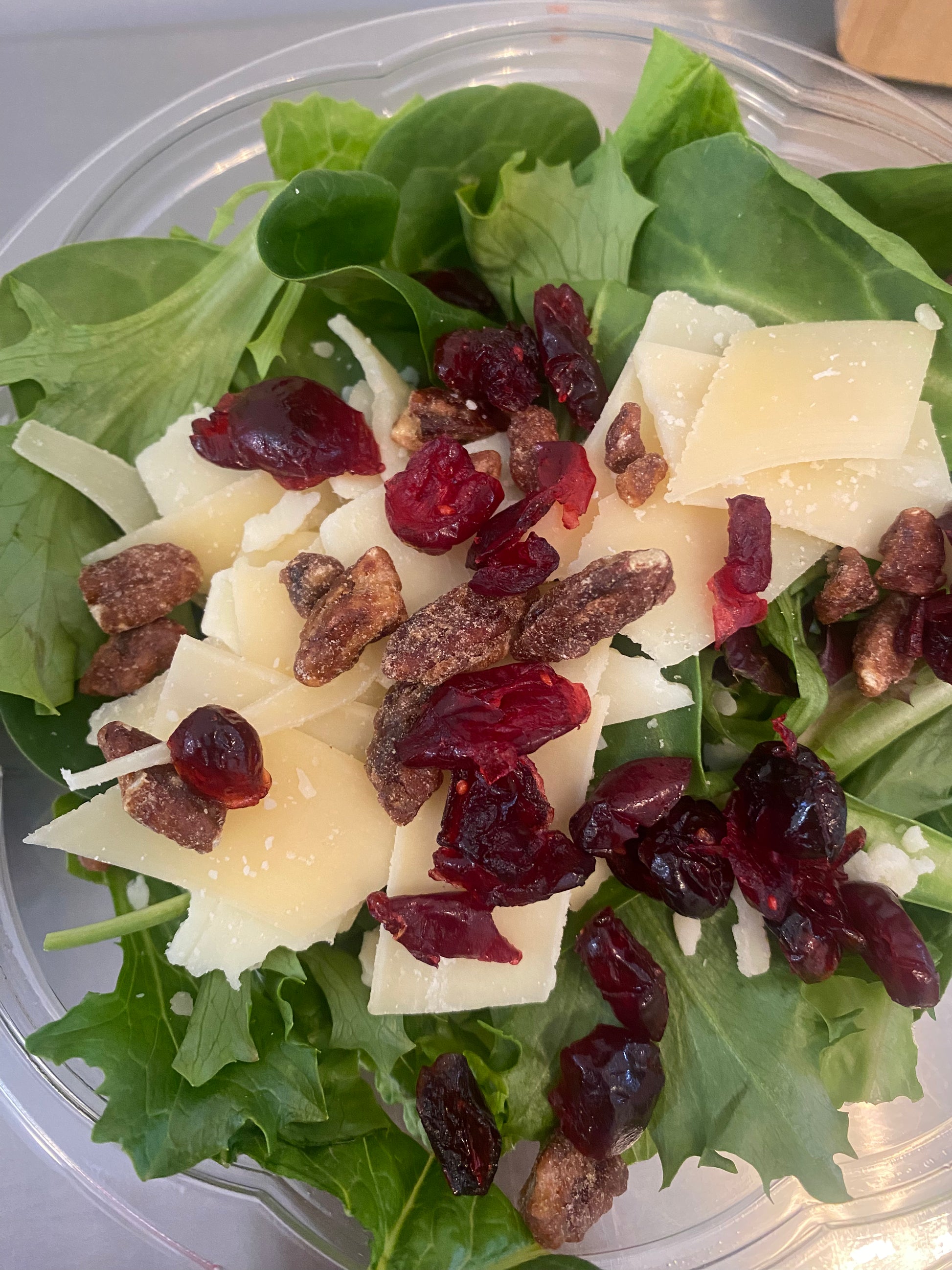 Fresh lettuce, shaved parmesan cheese, cranberries and candied pecans. Raspberry vinaigrette dressing.