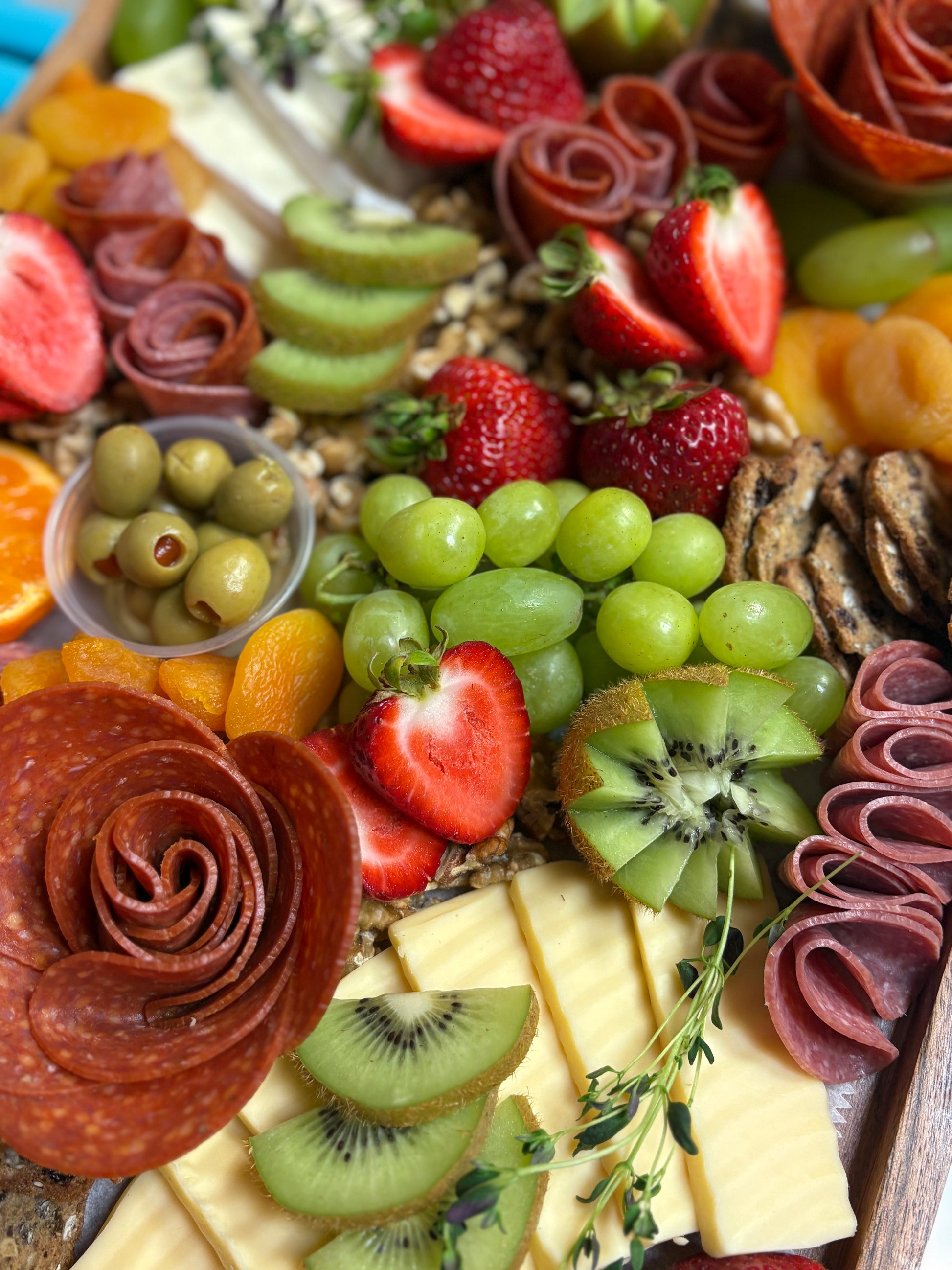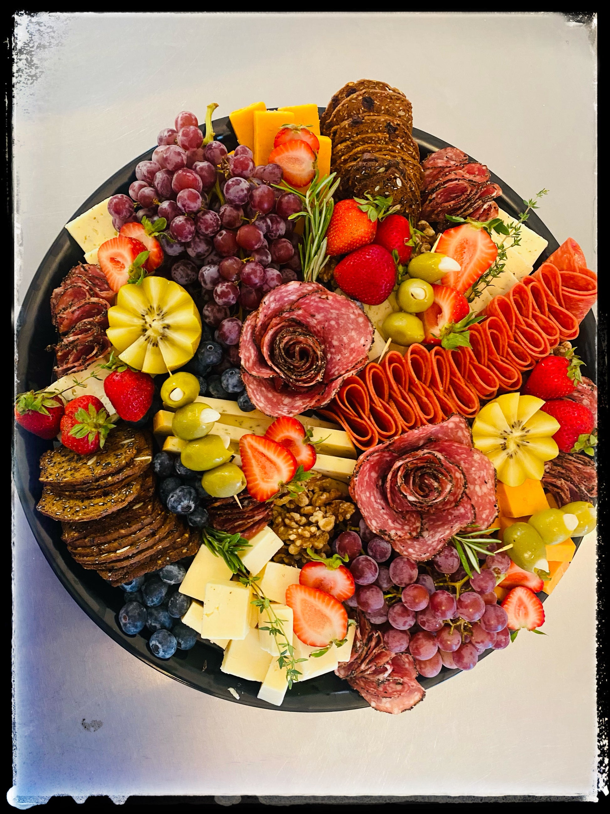 Includes an assortment of meats, cheese, nuts, fruits and garnishes.