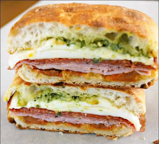 Salami, pepperoni, ham, banana peppers, roasted tomatoes, and provolone cheese. On toasted Ciabotta roll.
