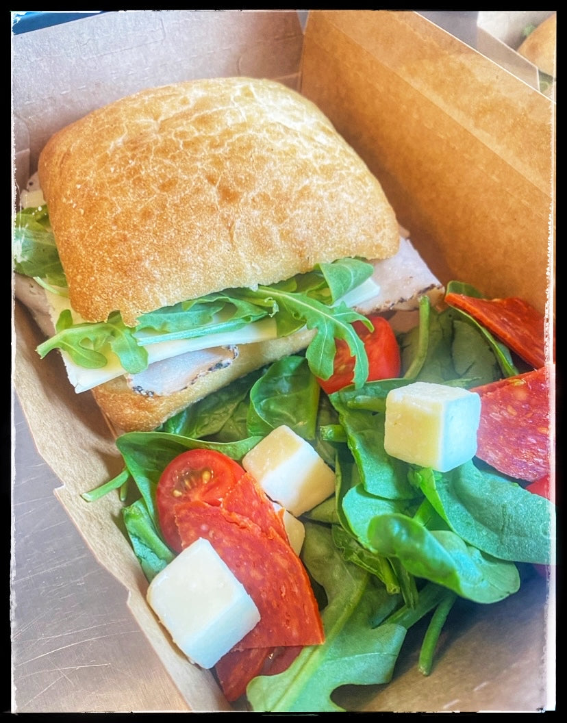 Full size Gourmet Turkey and Havarti on Ciabotta bread. Comes with house or antipasta salad.